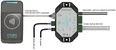 An example use of the VTAP100‑PRO‑EXP1 expansion board with the VTAP PRO reader would be door or turnstile control in an access control scenario. In this case the I/O expansion board might be used to connect to a door lock:
