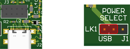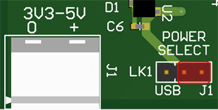 For either USB power scenario, the POWER SELECT link (LK1) should be set between its centre pin and the left pin (USB), as shown below. This will enable power over USB in addition to USB comms