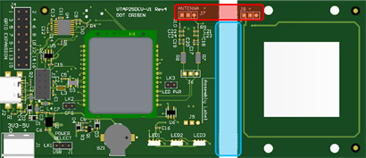 CAUTION: Always disable the VTAP25-DEV on-board antenna and tuning circuit before connecting an alternative antenna. Do this by removing R7, R8 and C25‑C28 antenna tuning components. Detaching the VTAP25-DEV on-board antenna is not required and would not be sufficient.