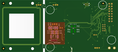 Carry out the antenna tuning process before starting to use it. This will include populating the appropriate tuning capacitors and resistors on the tuning network, on the bottom layer of the development board. The external antenna tuning capacitors C25‑C32 and resistors R11/R12 footprints are 1206. Capacitors should be 2% tolerance or better.