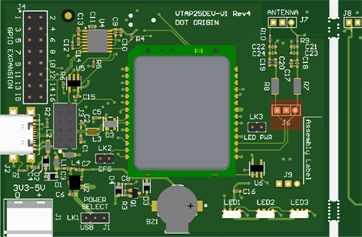 The on‑board NFC antenna on the VTAP25-DEV board can be used out‑of‑the‑box, as it is connected to the VTAP25‑MOD reader module through PCB tracks and is already tuned for its optimum performance. The VTAP25‑MOD is approved by FCC and ISED for use with this antenna .