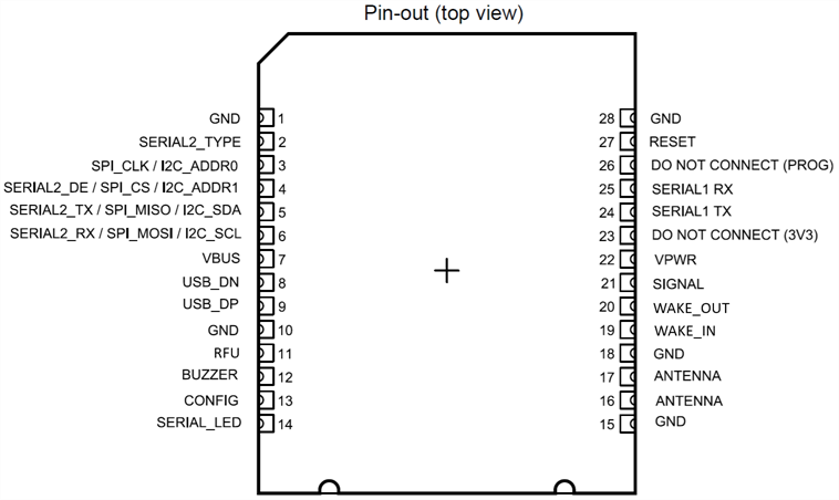 Driven by the host processor to wake VTAP25 from deep sleep mode. Details with next firmware release NOTE: In firmware before v2.4.0.0 this pin had the opposite sense. If you have a design using pin 19 as a WAKE output, this can be accommodated with a custom VTAP25 configuration option, please contact vtap-support@dotorigin.com for details. |